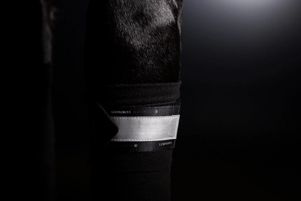 High quality fleece bandages in a stylish black. Decorated with reflective details and an Equestrian Stockholm badge in pitch black. Style with the saddle pad and ear net from the Luminous Black collection to complete a glamorous look. Sold in sets of four.