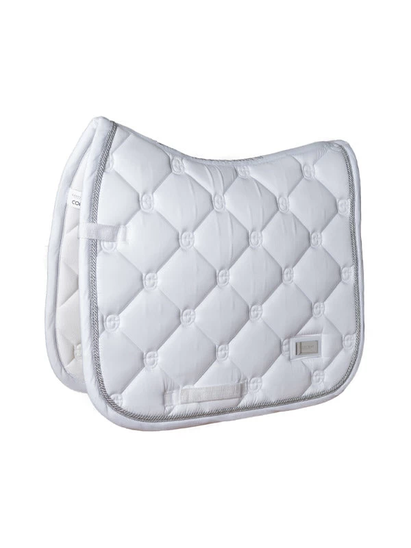 Nice dressage saddle pad in white with silver details and pattern in Equestrian Stockholm’s logo.