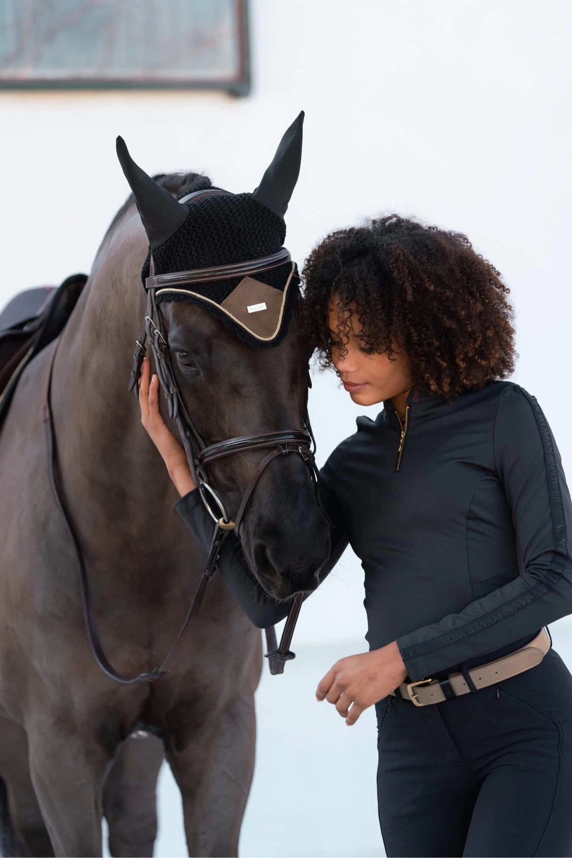The coolest color combination of the season is here! Luxurious ear net designed in black with gold and ‘Golden Brass’ details. It protects your horse from both insects and noise. Crocheted ear net with elastic cloth by the ears to prevent gall. Style with other pieces from the same collection for a complete look.Â