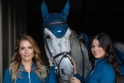 Luxurious, crocheted ear net in a sporty blue design. Decorated with a beautiful matching patch at the front, navy piping and a rose golden ES badge. The net helps with both insect protection and noise reduction. The ear net has elastic cloth by the ears for minimal gall. Matches perfectly with the saddle pad from the same collection.