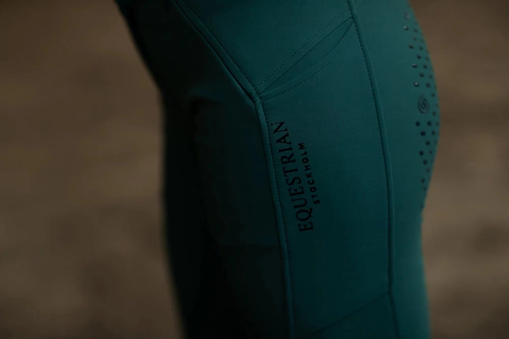 Our stylish riding breeches with full grip come in 4-way stretch material and a wider size range to fit you perfectly. Exclusive riding breeches designed in beautiful cool dark green colour and styled with the Equestrian Stockholm logo. Our riding breeches come with medium high waist and with four good-sized pockets, two with zippers and two pockets for mobile phones on the sides. Full seat silicon grip will help to keep you steady in the saddle. Style it with other products from the Sycamore Green collection for a complete look.
