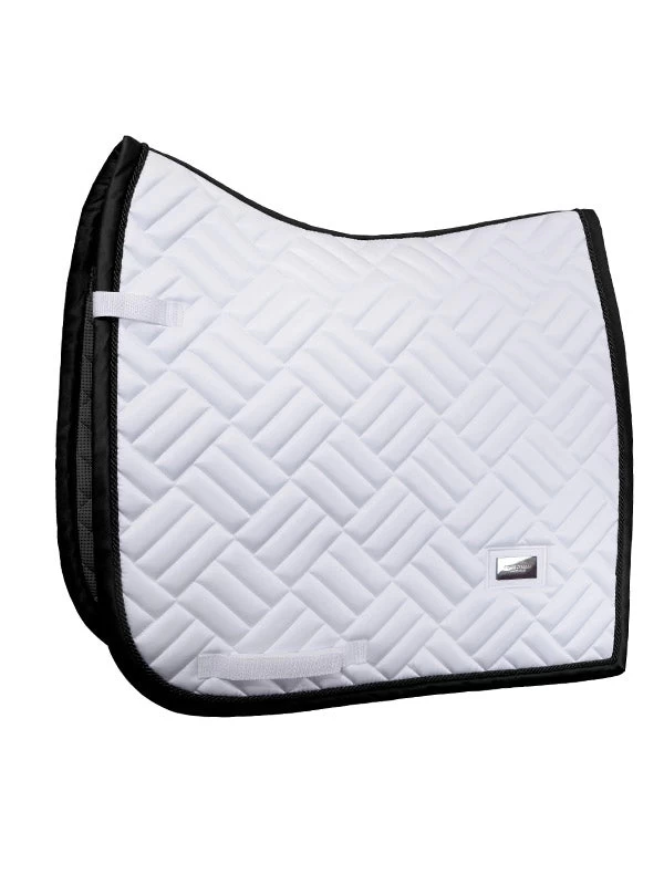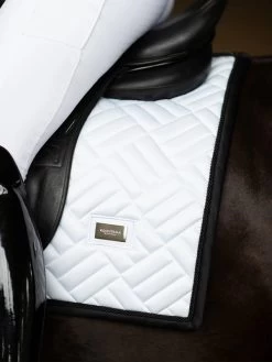 Elegant saddle pad with modern maze quilting in a white color with black and silver details. Decorated with the Equestrian Stockholm badge in silver. The bamboo material is perfect all year round due to its thermal regulating effect – cooling in the summer and warming in the winter. It is also quick dry, moisture wicking, and anti-bacterial. Style with other pieces from the Black Edition collection for a head-to-toe stylish look.
