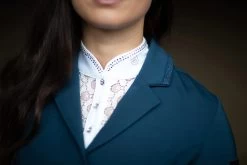 The competition jacket is made in beautiful blue colour and decorated with small, beautiful blue glittery details that will make you stand out during competitions. Designed with 4-buttons at the front with a hidden zip closure underneath to maintain a sleek look. What is great about this jacket is that it is washing machine safe, this saves you time so you can focus on your next competition and achieve your dreams. It also utilises recycled yarn which has a lower environmental impact. The competition jacket is decorated with an Equestrian Stockholm badge in dark navy blue.
