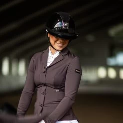 The competition jacket is made in beautiful brown/purple color and decorated with small, beautiful black glittery details that will make you stand out during competitions. Designed with 4-buttons at the front with a hidden zip closure underneath to maintain a sleek look. What is great about this jacket is that it is washing machine safe, this saves you time so you can focus on your next competition and achieve your dreams. It also utilises recycled yarn which has a lower environmental impact. The competition jacket is decorated with an Equestrian Stockholm badge in rose gold.