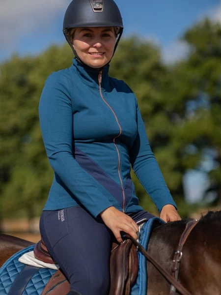 Equestrian Stockholm’s exclusive Victory jacket in a royal blue color, trendy navy-blue lines, and stylish rosé details. Decorated with an embroidered Equestrian Stockholm logo in a matching royal blue shade on one arm. All zippers are rosé gold. The jacket is made with threads that are made from recycled PET bottles. Of course, the jacket does not contain down or fur, to protect the animals.
