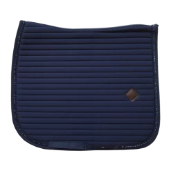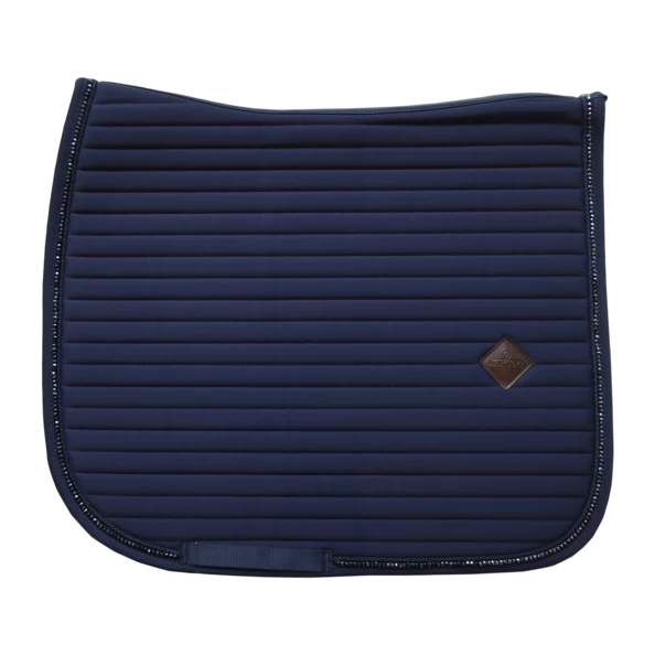 Our Saddle Pad Pearls is shaped for dressage and provides excellent cushioning between the horse’s back and the saddle while protecting against friction. This saddle pad has a unique horizontal quilting and is made out of a breathable material (43% Nylon, 43% Polyester and 14% Spandex). The stunning piping made out of pearls is a real eye-catcher! This saddle pad in combination with one of our Fly Veils Stone & Pearl (Long or Wellington) or Fly Veil Wellington Glitter Band is just drop-dead-gorgeous! The saddle pad has no annoying straps to attach to the saddle, only a nylon strap for the girth. It features a subtle leather logo in the same color as the saddle pad, whilst still offering enough room to embroider it if needed. The saddle pad is machine washable at 30°, no dryer. We advise you to use a washing bag to avoid the pearls from damaging. We advise you to use a washing bag to avoid the pearls from damaging.