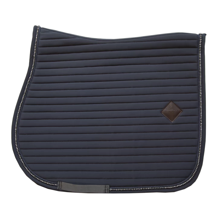 Our Saddle Pad Pearls is shaped for jumping and provides excellent cushioning between the horse’s back and the saddle while protecting against friction. This saddle pad has a unique horizontal quilting and is made out of a breathable material (43% Nylon, 43% Polyester and 14% Spandex). The stunning piping made out of pearls is a real eye-catcher! This saddle pad in combination with one of our Fly Veils Stone & Pearl (Long or Wellington) or Fly Veil Wellington Glitter Band is just drop-dead-gorgeous! The saddle pad has no annoying straps to attach to the saddle, only a nylon strap for the girth. It features a subtle leather logo in the same color as the saddle pad, whilst still offering enough room to embroider it if needed. The saddle pad is machine washable at 30°, no dryer. We advise you to use a washing bag to avoid the pearls from damaging.