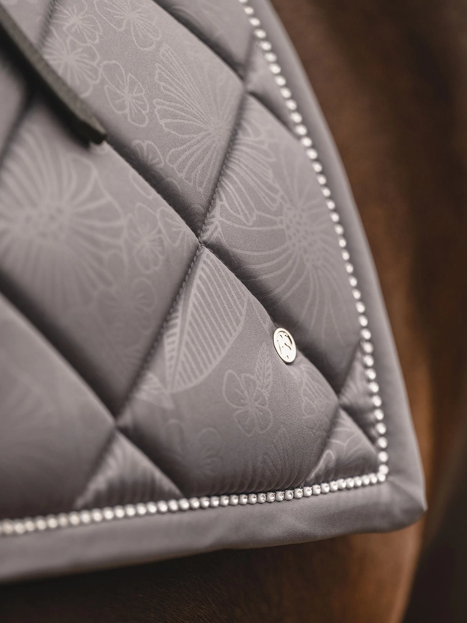 Anatomical saddle pad with beautiful rhinestones around the binding. The saddle pad has unique stop cushions for extra comfort. They keep the saddle pad in place and help remove friction. The inside is covered with an antibacterial quick-dry material that helps to transport away moisture and sweat. Dirt repellent material on the top with a beautiful flower print.