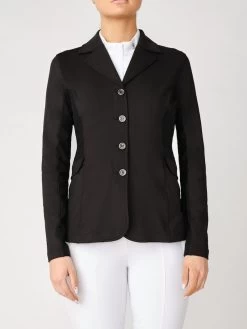 High function, tailored competition blazer made in a technical, stretchy material with a perfect fit. Button closing at the front and a hidden zipper underneath. Pockets at sides with hidden, discreet zippers. Double mesh (non-see through) on the back, sides and under arms for optimal ventilation. Design details such as shiny lining inside peplum and tonal logo on left sleeve.