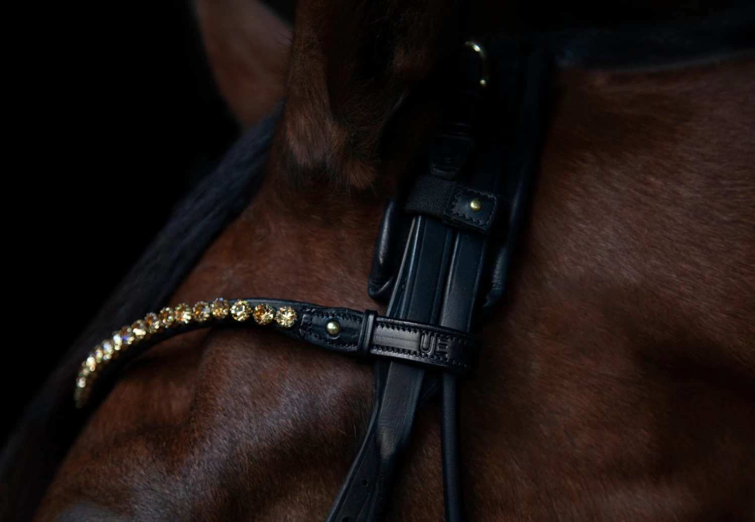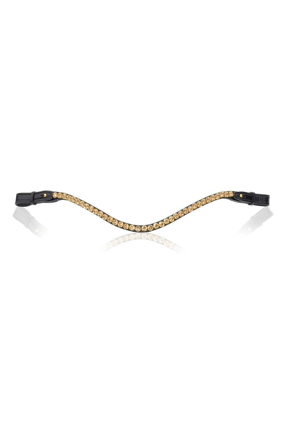 Browband with shiny crystals handmade in our exclusive Italian leather. The browband has a stud on the inner side, which enables you to easily change the browband without having to remove it from the horse’s head.