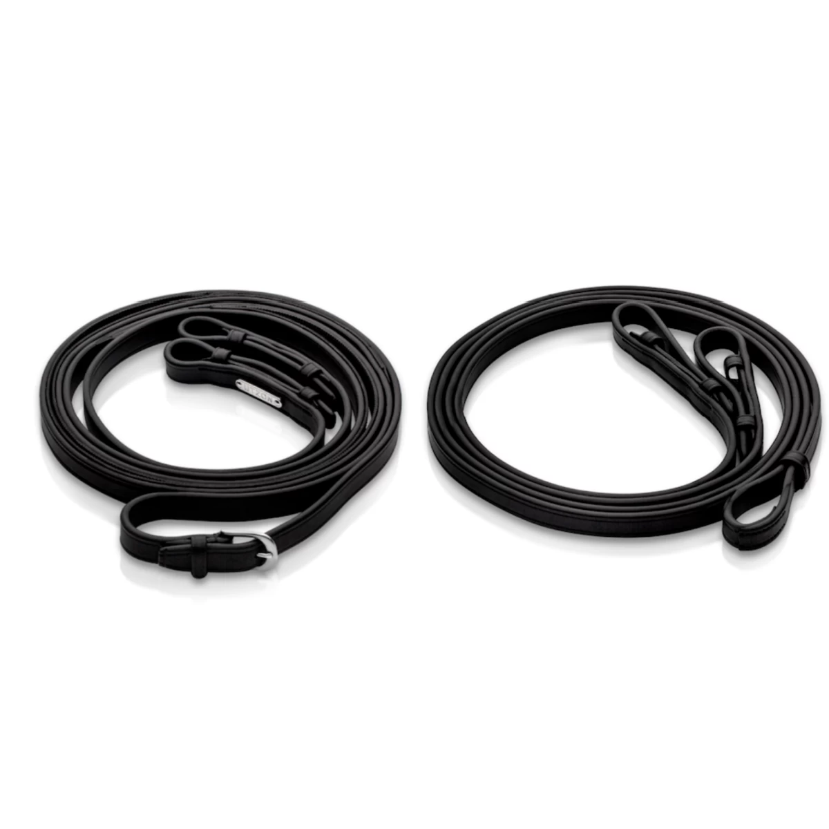 Flat double leather reins. One rein is with super grip and the curb rein is in full leather. The buckles are turned inwards. The reins are in full leather and very luxurious.